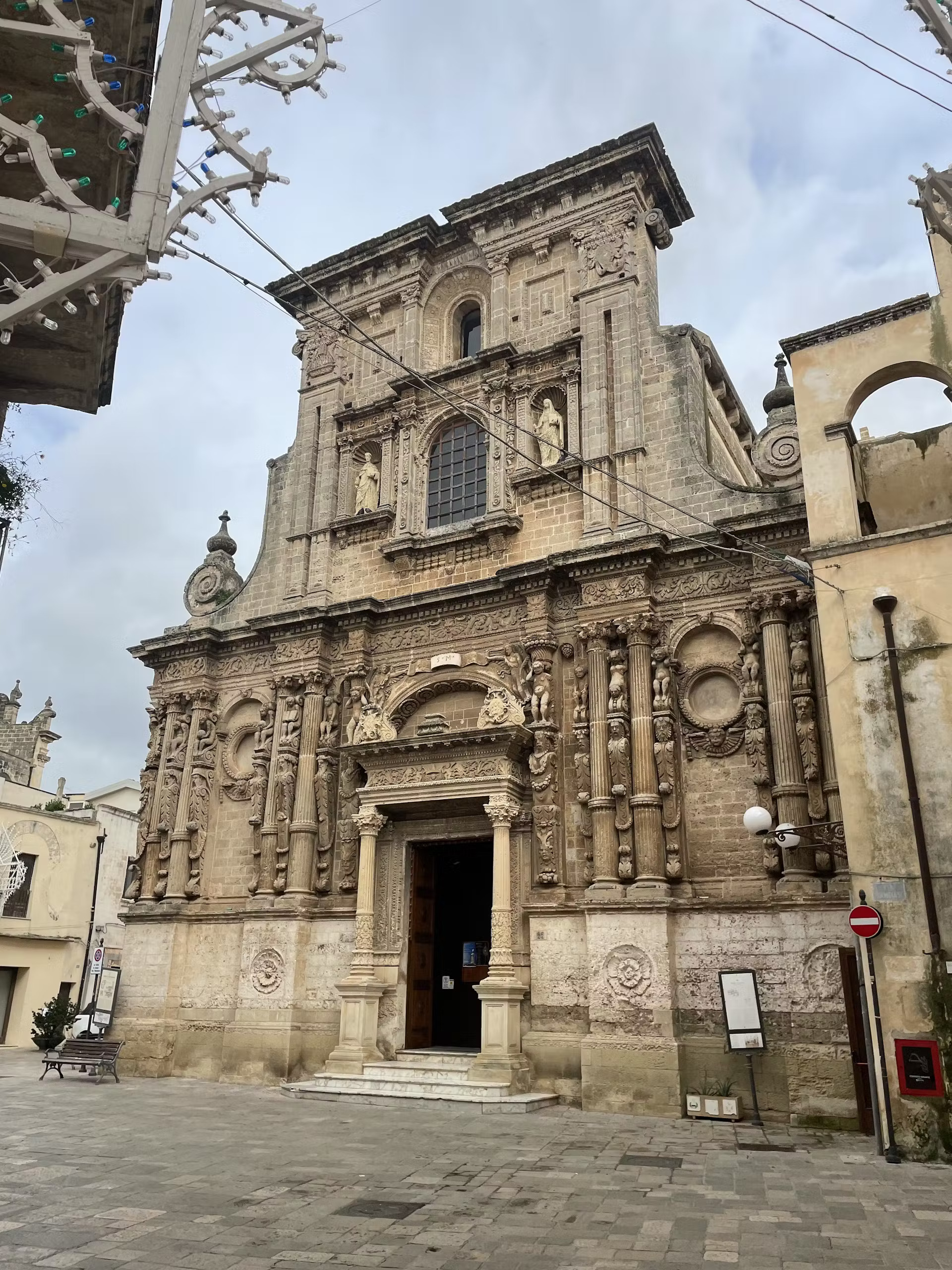 La chiesa di San Domenico è una parte di un complesso domenicano probabilmente edificato agli inizi del Trecento in pieno stile gotico, poi ristrutturato in epoca tardo cinquecentesca, per poi essere nuovamente ricostruito a metà del XVIII secolo dopo il terremoto del 1743. Comprende appunto la chiesa, la sacrestia, un imponente campanile e l’adiacente convento (oggi sede del Liceo Artistico). La chiesa fu costruita (insieme al convento) intorno agli inizi del ‘300 ed era originariamente intitolata a Santa Maria de Raccomandatis. Tra il 1580 ed il 1594, in piena Controriforma e seguendo i dettami del Concilio di Trento, fu totalmente ricostruita grazie all’intervento dell’architetto neritino Giovan Maria Tarantino, che ne trasformò sostanzialmente l’involucro esterno (facciata e prospetto laterale) in uno dei primi esempi di barocco leccese. In seguito al terremoto del 1743 la fabbrica fu quasi totalmente distrutta, ad eccezione della facciata, del muro laterale e di parte della sacrestia. La facciata è suddivisa in due registri differenti: la parte inferiore è ricca di figure umane e cariatidi addossate le une alle altre, mentre la parte superiore presenta forme più schematiche. L’interno, ad un’unica navata con pianta a croce latina e tre cappelle per parte, fu ricostruito dopo il 1743. La sacrestia della chiesa è solitamente chiusa al pubblico.