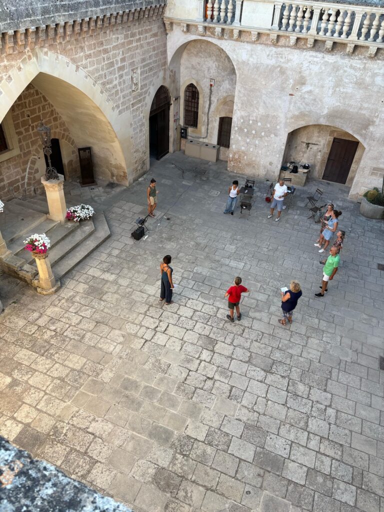 Giovedì 3 luglio dalle 19:00 (ritrovo ore 18:45 | partecipazione gratuita | info e prenotazioni 3519137972) la visita guidata partirà dal Castello Volante di Corigliano d’Otranto, seguendo il filo invisibile dell’acqua che, come la musica, attraversa confini e connette persone. Le partecipanti e i partecipanti scopriranno come, nel tempo, l’essere umano abbia affrontato e risolto il problema idrico in un territorio storicamente povero di acqua, come quello della Puglia e della Grecía Salentina. A partire dalle eloquenti fotografie dell’Archivio Palumbo e dalle antiche cisterne custodite nell’antico maniero, il percorso condurrà fino alla “vasca” dell’Acquedotto Pugliese, uno dei più grandi serbatoi idrici fuori terra d’Europa, per assistere alla restituzione del laboratorio. Lungo il cammino, si incontreranno le Pozzelle — veri e proprie vasche naturali di comunità — e si raggiungerà una dolina carsica, il Laccu te lu Murica, dove un tempo i piccoli del paese andavano a giocare, “come cerchi nell’acqua che non sanno nuotare”. Alle 20:00 ai piedi del Serbatoio alto la restituzione pubblica del laboratorio di teatro comunitario che ha coinvolto un gruppo eterogeneo di persone per età, provenienza ed esperienza: Frantumare le distanze è il primo verso di “Cerchi nell’acqua“, canzone del cantautore Paolo Benvegnù, scomparso prematuramente pochi mesi fa, che dà il titolo e il senso a questa edizione del festival. Frantumare le distanze è anche una sintesi perfetta di quello che può fare il teatro. Frantumare le distanze è infine anche quello che fa l’acqua, elemento liquido che unisce sponde e travalica steccati, in continuo, instancabile movimento: cammina imperterrita, senza chiedersi perché. Le persone partecipanti sono state invitate, attraverso le pratiche ludiche e comunitarie dell’arte teatrale a manipolare testi, fisicità e movimenti, stimolati dal tema dell’acqua e dalle parole dei brani di Benvegnù. È stato così dato corpo e voce a piccole storie personali fino a costruire una cartografia emotiva, sensoriale, e relazionale. Il teatro è stato dunque il mezzo di una comunicazione sociale e allo stesso tempo anche di espressione individuale e di progettazione condivisa. «Questa restituzione finale non mira alla compiutezza di una drammaturgia teatrale convenzionale, obiettivo che avrebbe tolto spazio al processo di ricerca individuale e collettiva a favore di un’apparente professionalità della confezione», sottolinea Alessandra De Luca. «Ci è sembrato più interessante invece pensarla e strutturarla come la raccolta di appunti di viaggio, l’esposizione cruda e la giustapposizione di momenti di un processo incompiuto ma vivo, come deve esserlo ogni processo autenticamente creativo. Non uno spettacolo dunque, quanto l’esposizione del percorso vivo di un gruppo variegato di persone di età e provenienze diverse».