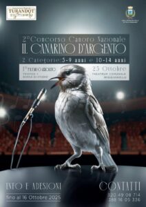 L’associazione musicale Turandot intona la seconda edizione del concorso canoro nazionale “Il Canarino d’Argento” riservato a 2 categorie di partecipanti: Cat. A dai 5 ai 9 anni, Cat. B dai 10 ai 14 anni.