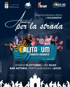 Protagonisti della serata saranno i Talitakum Taranta Migrante, gruppo di musica popolare salentina, che nei pressi del Bar Astoria, con la forza della pizzica porteranno in piazza San Biagio una lunga tracklist di musica popolare, un viaggio tra tradizione e inclusione capace di unire generazioni, culture e storie diverse e capace di far sentire il calore di una collaborazione di intenti nella comunità cittadina.