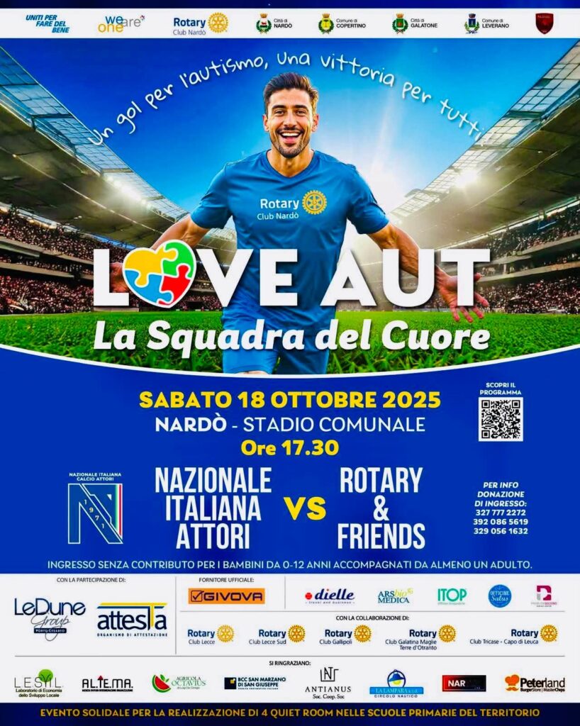 Sabato 18 ottobre alle ore 17:30, presso lo Stadio Comunale di Nardò “Giovanni Paolo II” si svolgerà l’evento “LOVE AUT”, dedicato al disturbo dello spettro autistico: una partita solidale che vedrà scendere in campo la Nazionale Calcio Attori e la squadra Rotary and Friends.