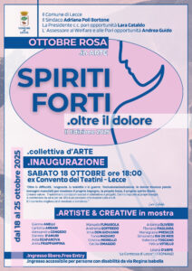 Per Ottobre Rosa, il mese della prevenzione e della resilienza femminile, il 18 ottobre alle ore 18.00, presso l’ex Convento dei Teatini, inaugurazione, alla presenza della sindaca di Lecce, on. Adriana Poli Bortone, dell’evento “SPIRITI FORTI – Oltre dolore”.