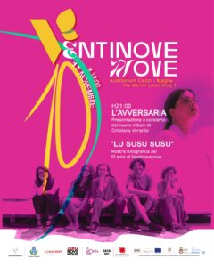Dieci anni di spettacoli dal vivo, arte e relazioni: la cooperativa Ventinovenove, fondata da Mary Negro e Gabriele Polimeno, spegne le candeline e si festeggia con “Ventinovenove10” due giornate di incontri, mostre e taglio della torta. I festeggiamenti iniziano lunedì 17 novembre (data esatta del compleanno della cooperativa), a partire dalle 19, presso l’Auditorium Cezzi di Maglie, in via Martin Luther King 3, con l’inaugurazione della mostra fotografica “Lu susu susu”, una mostra fotografica che ripercorre i primi dieci anni di attività della cooperativa. Dopo il brindisi accompagnato dalla musica di omaggio musicale a cura di Luca Buccarella (Kalàscima) ed Emanuela Rorro, alle 21, il concerto di Cristiana Verardo che presenta il suo nuovo album “L’Avversaria”.