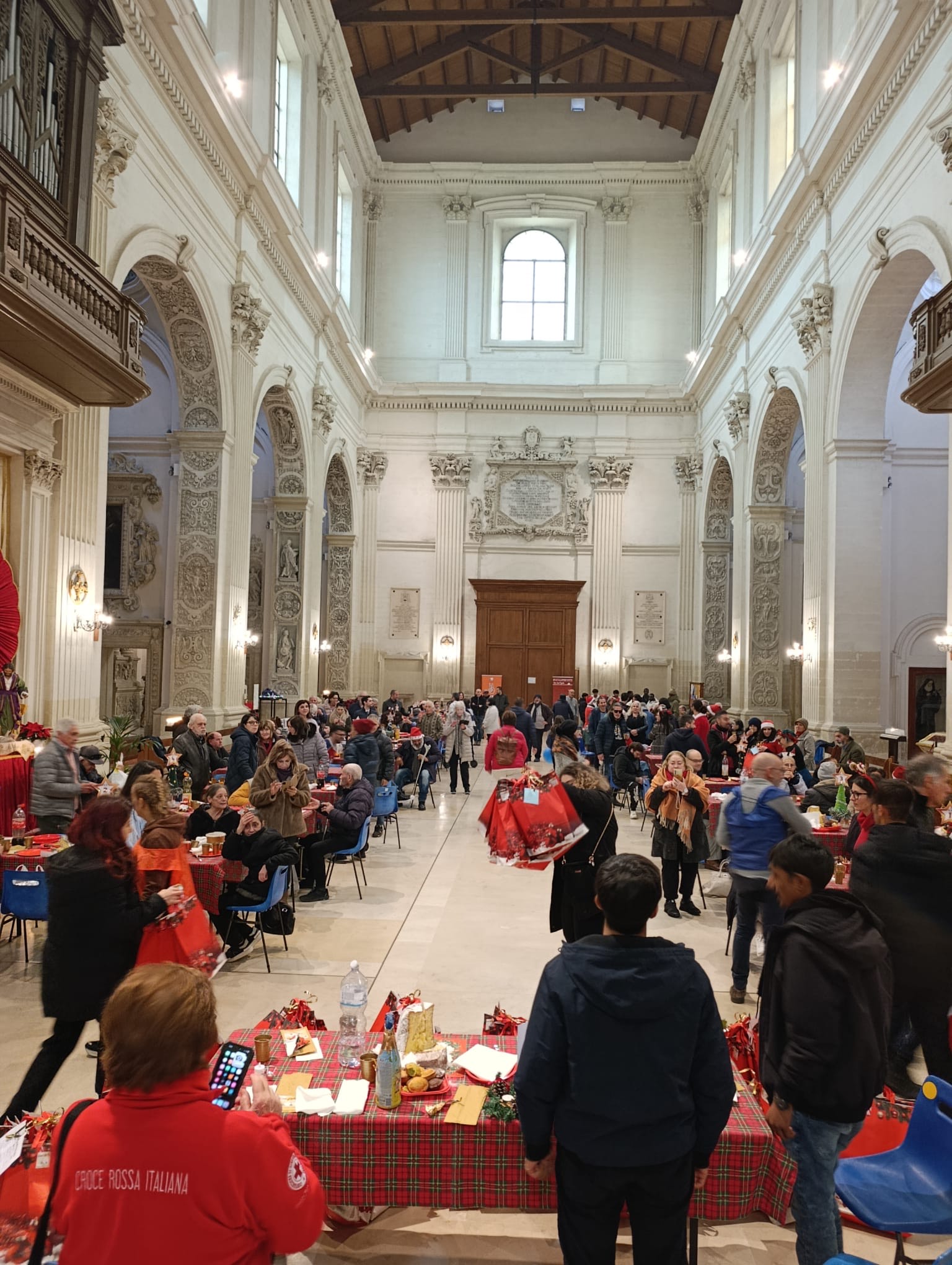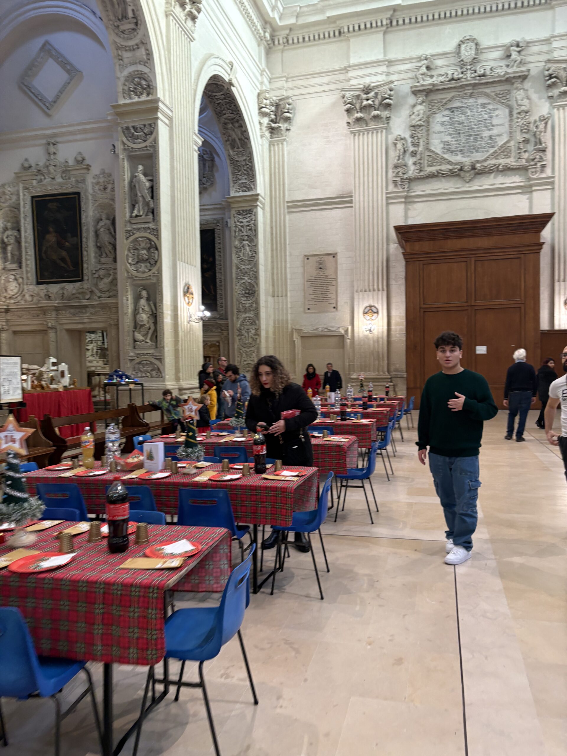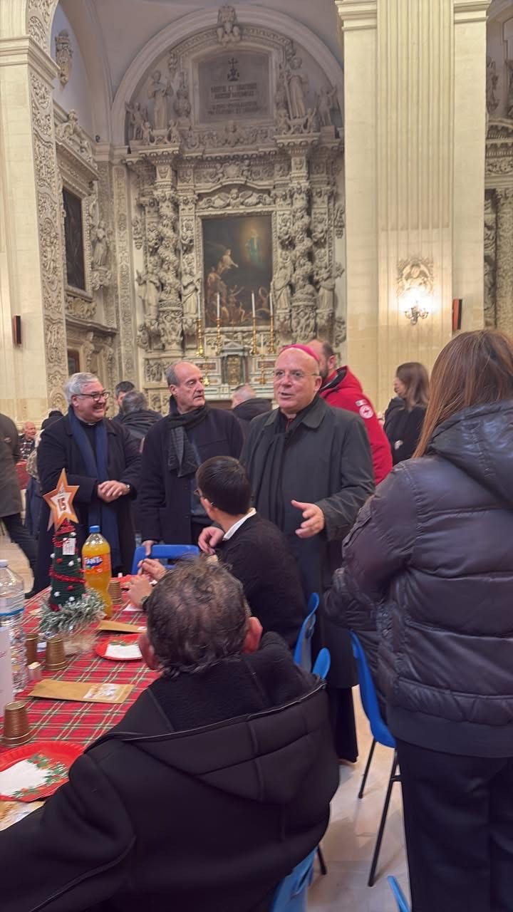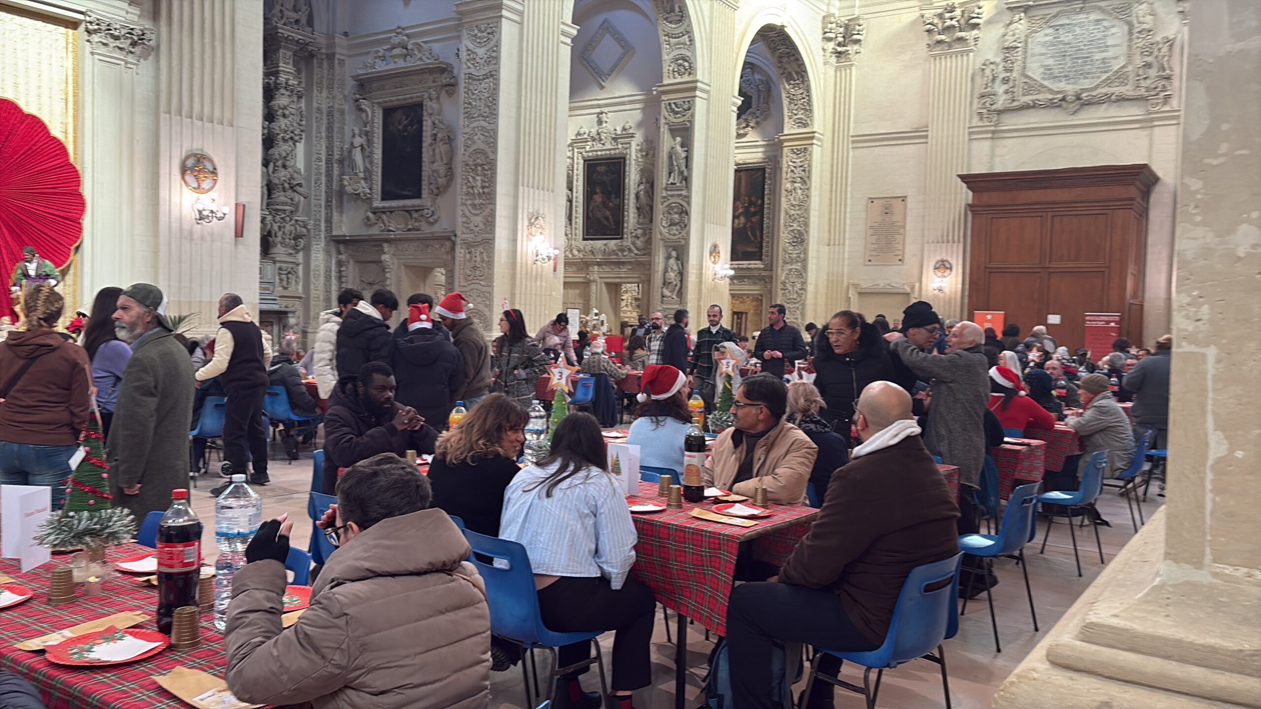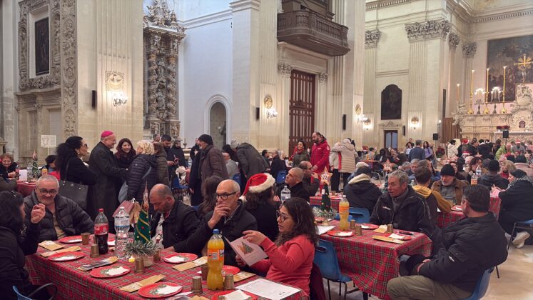 La Comunità di Sant’Egidio è un movimento internazionale di laici, che si fonda su preghiera, poveri e pace e ha la sede centrale storica a Roma. Presente in tutto il mondo, la Comunità ha registrato a Natale 2025, circa 80mila ospiti in Italia e in 250mila nel mondo insieme per la festa più bella dell’anno, come recita il comunicato stampa di Sant’Egidio. Insieme ai senza fissa dimora, anziani soli, famiglie in difficoltà, minori stranieri non accompagnati, rifugiati venuti da corridoi umanitari. Comunità cristiana nata nel 1968 a Roma all’indomani del Concilio Vaticano II, per iniziativa di Andrea Riccardi in un liceo del centro di Roma ed oggi diffusa in 70 Paesi del mondo, con particolare attenzione alle periferie e ai periferici, raccoglie uomini e donne di ogni età e condizione uniti da un legame di fraternità nell’ascolto del Vangelo e nell’impegno volontario e gratuito per i poveri e la pace. La Chiesa di Sant’Irene a Lecce ha visto innanzitutto la celebrazione eucaristica del Natale al mattino a cura di don Emanuele Tramacere e la sua profonda riflessione nella commovente omelia sull’Amore essenziale di Cristo che “si sa spogliare” (da kevòς parola greca che significa “spoglio”, “privo” ) , Gesù Cristo che incarnandosi prende la forma di servo , come descritto nella Lettera ai Filippesi (2:7) e la salvezza del mondo che ha senso solo se va verso tutti i confini del mondo e li supera (dal greco xenos “straniero“). La meravigliosa chiesa barocca di fronte alla Piazza Sant’Oronzo in linea d’aria è diventata la sede nella sua ampia navata centrale, di circa una trentina di tavolate ampie con una decina di posti a sedere cadauna che hanno preso il posto dei banchi. Proteggere la pace con la consapevolezza che la guerra è di fatto la madre di ogni povertà, spinge la Comunità a lavorare facilitando dialogo nell’impegno ecumenico e nel dialogo interreligioso nello “Spirito di Assisi”. Maria Teresa Greco la responsabile della Comunità di Sant’Egidio che a Lecce ha sede in Via Vito Fazzi, dove si organizza l’aiuto quotidiano per i più bisognosi, sostiene speranzosa: “lo abbiamo definito un sacramento del povero, perché i poveri sono parte della nostra famiglia, stare con i poveri non rappresenta per noi solo dare aiuto materiale, ma significa un incontro, un’amicizia, un legame che ci cambia e ci fa incontrare Gesù. Il pranzo di Natale è il simbolo di una società che vogliamo realizzare: pacifica”. L’arcivescovo Metropolita Mons. Angelo Raffaele Panzetta ha regalato la sua presenza generosa salutando e benedicendo tutti presso il pranzo di Sant’Irene.