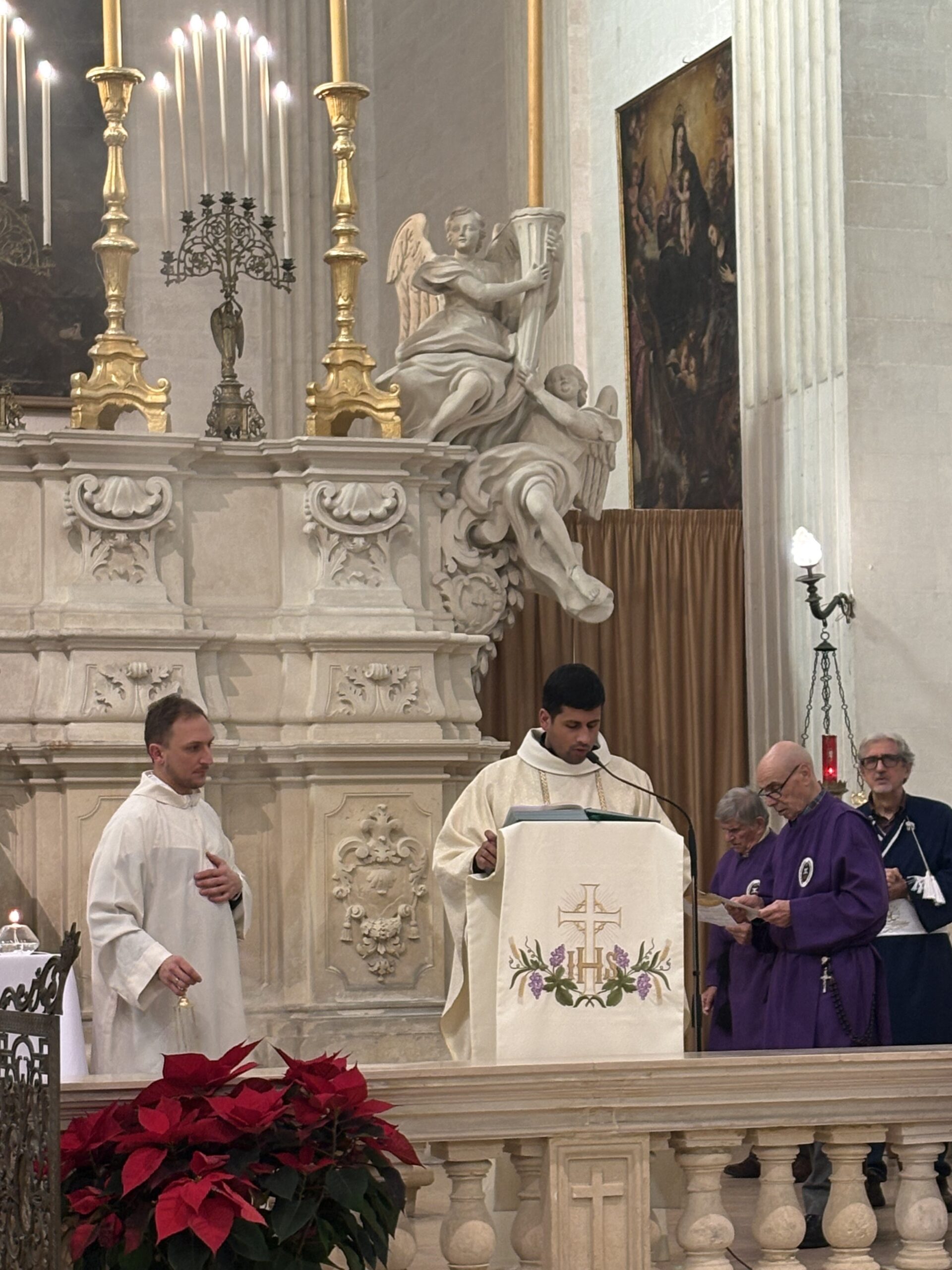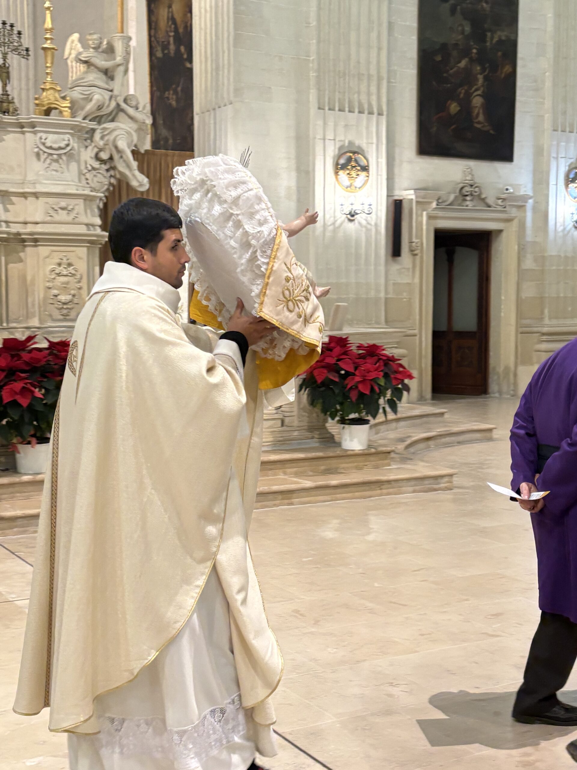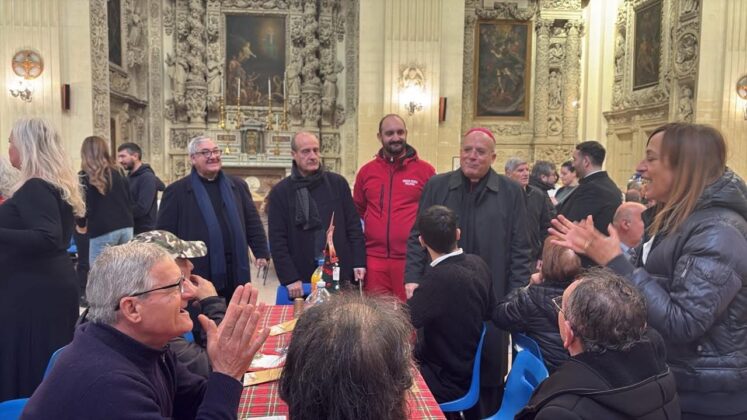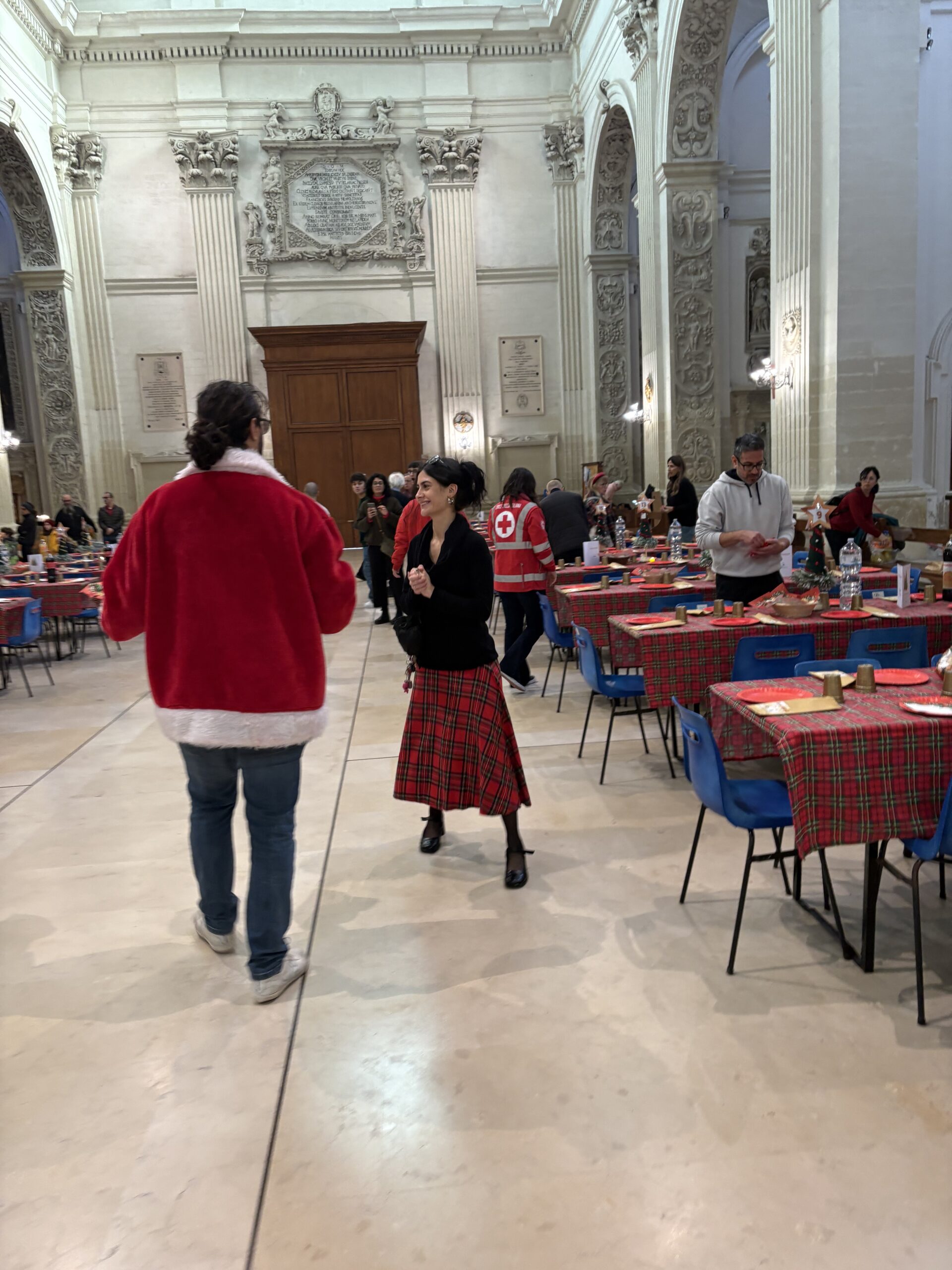 La Comunità di Sant’Egidio è un movimento internazionale di laici, che si fonda su preghiera, poveri e pace e ha la sede centrale storica a Roma. Presente in tutto il mondo, la Comunità ha registrato a Natale 2025, circa 80mila ospiti in Italia e in 250mila nel mondo insieme per la festa più bella dell’anno, come recita il comunicato stampa di Sant’Egidio. Insieme ai senza fissa dimora, anziani soli, famiglie in difficoltà, minori stranieri non accompagnati, rifugiati venuti da corridoi umanitari. Comunità cristiana nata nel 1968 a Roma all’indomani del Concilio Vaticano II, per iniziativa di Andrea Riccardi in un liceo del centro di Roma ed oggi diffusa in 70 Paesi del mondo, con particolare attenzione alle periferie e ai periferici, raccoglie uomini e donne di ogni età e condizione uniti da un legame di fraternità nell’ascolto del Vangelo e nell’impegno volontario e gratuito per i poveri e la pace. La Chiesa di Sant’Irene a Lecce ha visto innanzitutto la celebrazione eucaristica del Natale al mattino a cura di don Emanuele Tramacere e la sua profonda riflessione nella commovente omelia sull’Amore essenziale di Cristo che “si sa spogliare” (da kevòς parola greca che significa “spoglio”, “privo” ) , Gesù Cristo che incarnandosi prende la forma di servo , come descritto nella Lettera ai Filippesi (2:7) e la salvezza del mondo che ha senso solo se va verso tutti i confini del mondo e li supera (dal greco xenos “straniero“). La meravigliosa chiesa barocca di fronte alla Piazza Sant’Oronzo in linea d’aria è diventata la sede nella sua ampia navata centrale, di circa una trentina di tavolate ampie con una decina di posti a sedere cadauna che hanno preso il posto dei banchi. Proteggere la pace con la consapevolezza che la guerra è di fatto la madre di ogni povertà, spinge la Comunità a lavorare facilitando dialogo nell’impegno ecumenico e nel dialogo interreligioso nello “Spirito di Assisi”. Maria Teresa Greco la responsabile della Comunità di Sant’Egidio che a Lecce ha sede in Via Vito Fazzi, dove si organizza l’aiuto quotidiano per i più bisognosi, sostiene speranzosa: “lo abbiamo definito un sacramento del povero, perché i poveri sono parte della nostra famiglia, stare con i poveri non rappresenta per noi solo dare aiuto materiale, ma significa un incontro, un’amicizia, un legame che ci cambia e ci fa incontrare Gesù. Il pranzo di Natale è il simbolo di una società che vogliamo realizzare: pacifica”. L’arcivescovo Metropolita Mons. Angelo Raffaele Panzetta ha regalato la sua presenza generosa salutando e benedicendo tutti presso il pranzo di Sant’Irene.