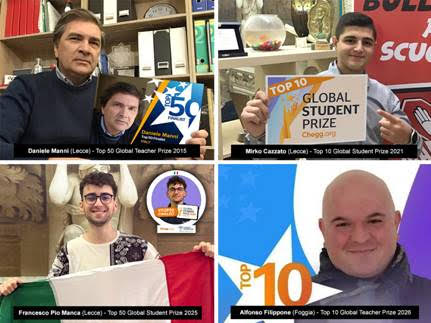 Nei 10 anni di attività del Global Teacher Prize sono 11 i docenti italiani selezionati tra i finalisti, due dei quali sono pugliesi (Daniele Manni Top 50 nel 2015 da Lecce e Alfonso Filippone Top 10 nel 2026 da Foggia), mentre nei 5 anni del Global Student Prize sono solo 3 gli studenti italiani giunti in finale, due su tre sono pugliesi: Mirko Cazzato Top 10 nel 2021 e Francesco Pio Manca Top 50 nel 2025, entrambi di Lecce.