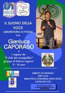 CAVALLINO (Lecce) Sabato 24 gennaio, alle ore 16.00, presso la Biblioteca Comunale “Gino Rizzo” di Cavallino (LE), si terrà il laboratorio di poesia “Il suono della voce”, condotto dallo scrittore e poeta Gianluca Caporaso.