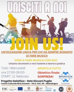 MELENDUGNO (Lecce) – Un’occasione unica per chi ha sempre sognato di trasformare una passione chiusa nel cassetto in una realtà da condividere sul palco. Parte ufficialmente l’11 febbraio a Melendugno il progetto musicale targato Galattica – Rete Giovani Puglia, un’iniziativa che punta a rimettere la creatività giovanile al centro del territorio.